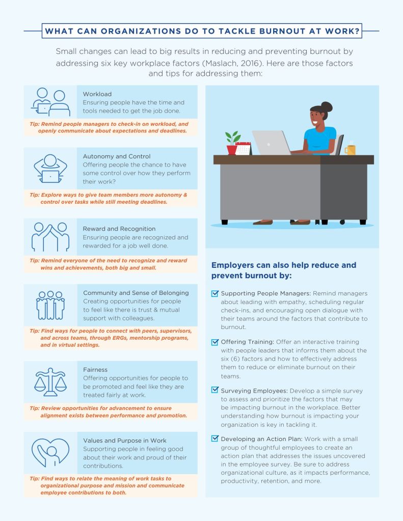This infographic walks us through the stages of burnout for someone might experience. This is a simple but powerful visual that shows the worsening effects of burnout accompanied by clear, relatable descriptions for each one. The colors of the flame (representing the ‘burn’ or burnout) are different according to the different stages, which are numbered so they are easy to follow. This has a clean look that is easy to read. The stage numbers are bolded, and descriptions are underneath.